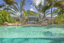 -70,000 litre concrete swimming pool with water feature set amongst tropical plants